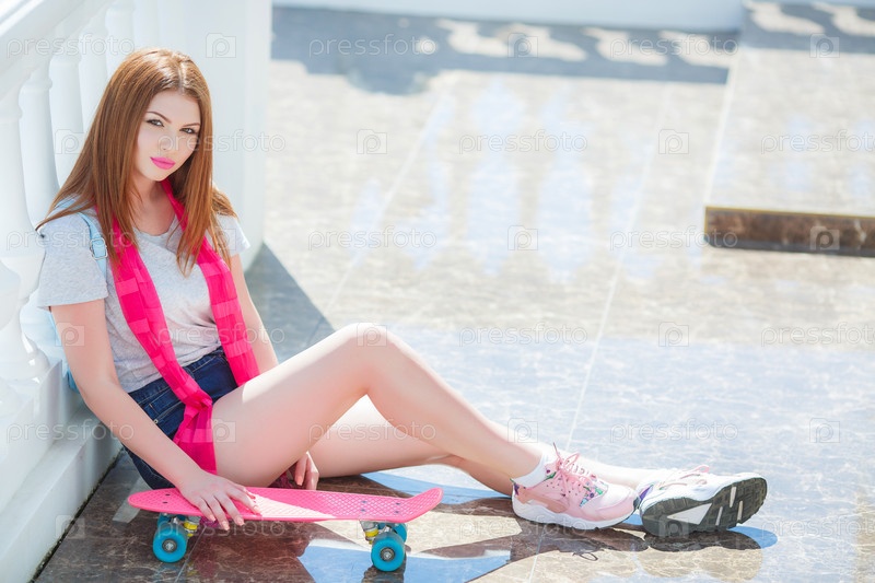 Красивая брюнетка со скейтбордом