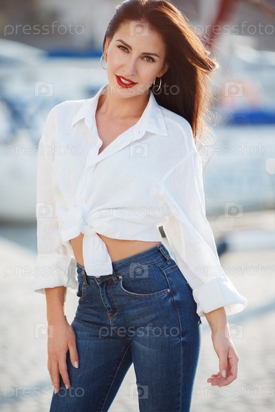 Стильная брюнетка на пирсе