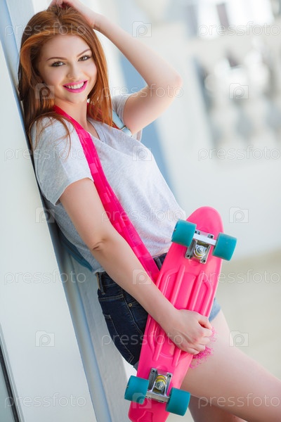 Красивая брюнетка со скейтбордом