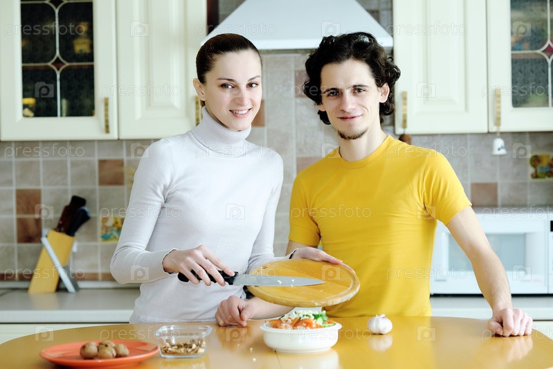 Молодая пара на кухне готовит вегетарианскую еду