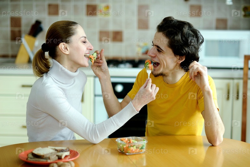 Счастливая молодая пара ест на кухне