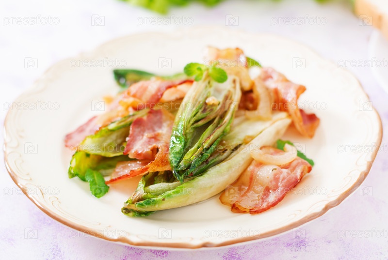 Запеченный цикорий с беконом, луком и зеленью