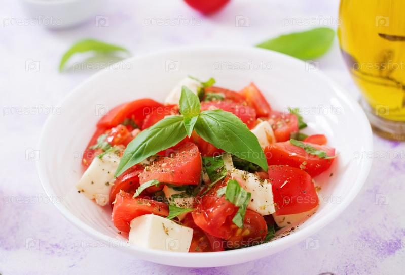 Свежий салат с помидорами, сыром моцарелла и базиликом