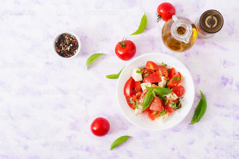 Свежий салат с помидорами, сыром моцарелла и базиликом