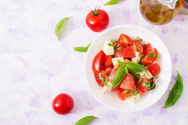 Свежий салат с помидорами, сыром моцарелла и базиликом