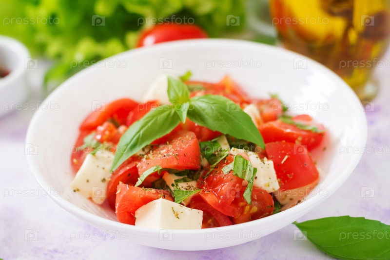 Свежий салат с помидорами, сыром моцарелла и базиликом