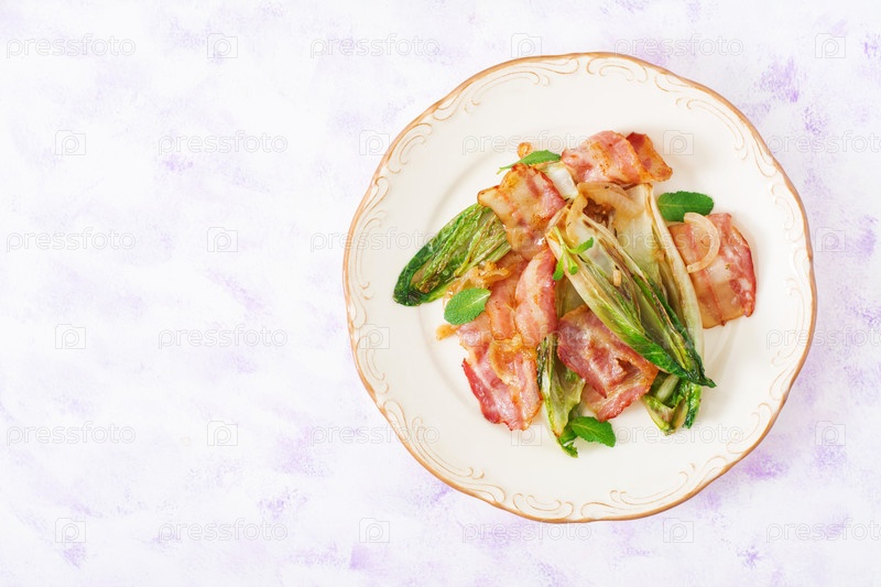 Запеченный цикорий с беконом, луком и зеленью. Вид сверху