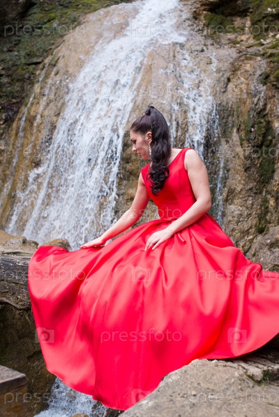 Красивая женщина на фоне водопада