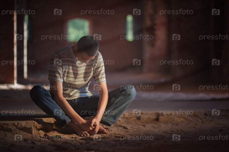 Подавленный мужчина сидит на песке