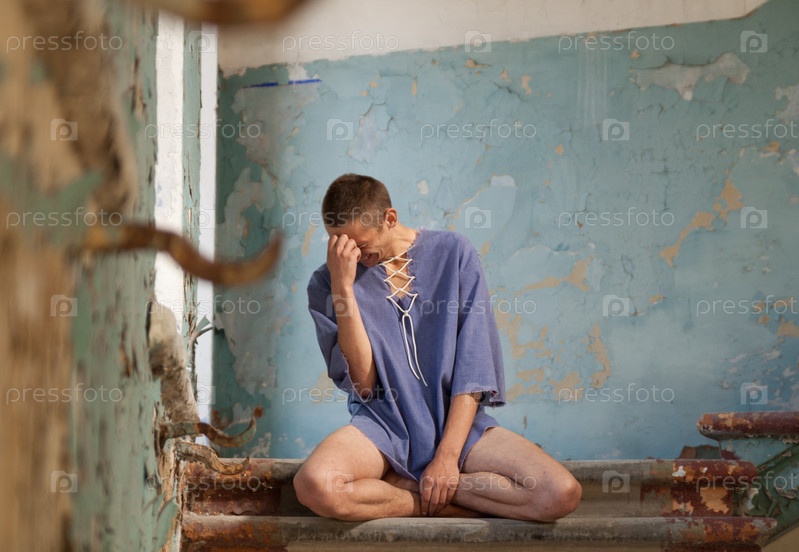 Бедный человек плачет на лестнице разрушенного дома