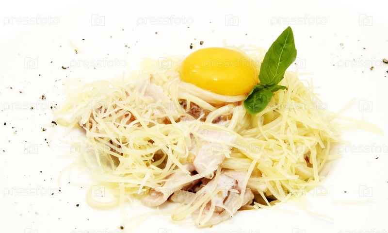 Спагетти с яйцом и зеленью на белом фоне
