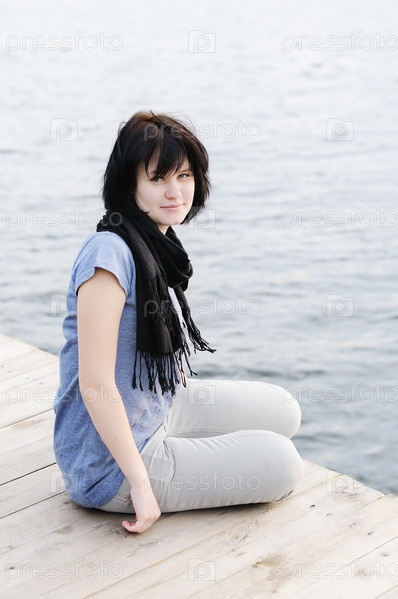Молодая женщина сидит на пристани у воды