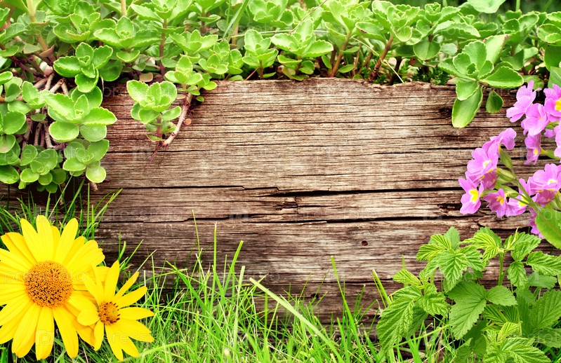 Летний фон со старой деревянной доской, травой и зелеными листья