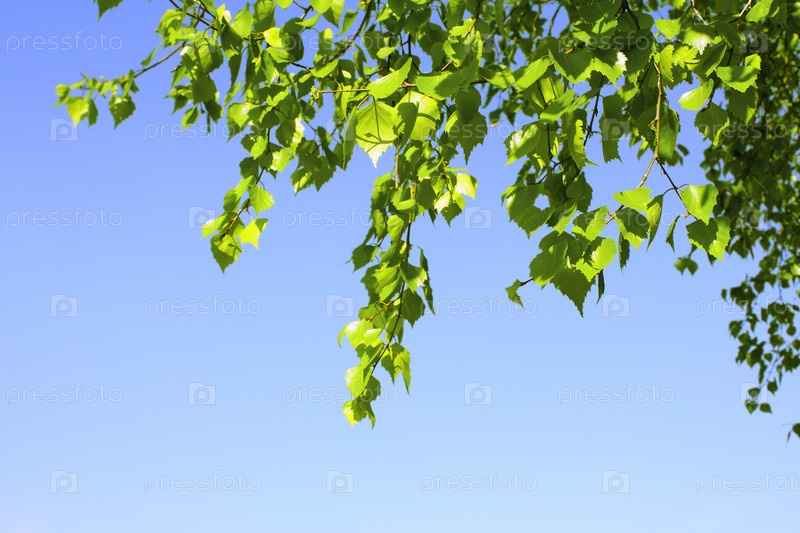 Листья березы на фоне голубого неба