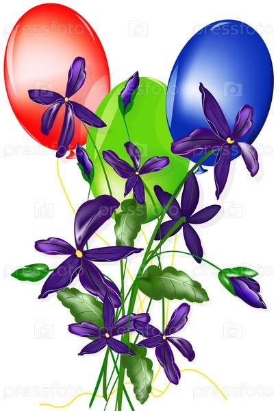Праздничные воздушные шарики и букет цветов на белом фоне