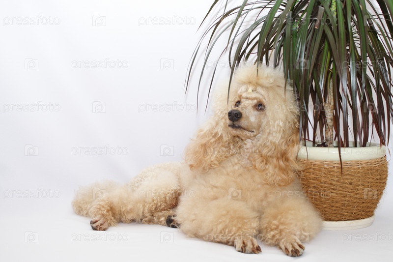 Пудель возле цветочного горшка