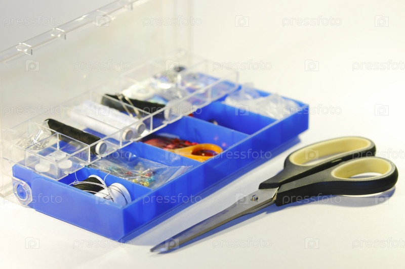 Набор для шитья. Инструменты, нитки и ножницы на столе