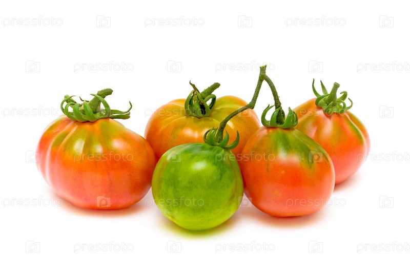 Красные и зеленый помидоры на белом фоне