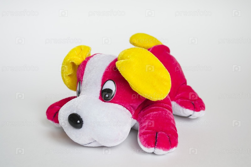Розовая игрушка собака с желтыми ушами на сером фоне