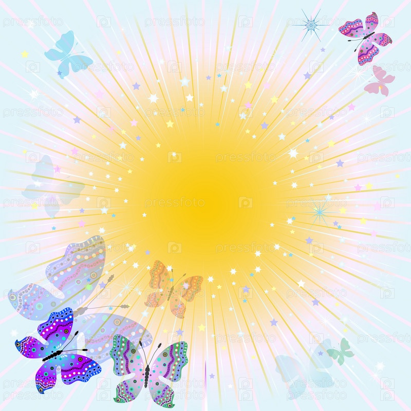 Солнечная весенняя иллюстрация с бабочками в солнечных лучах