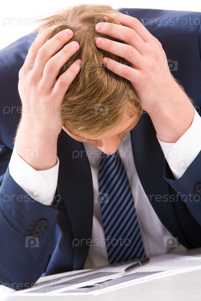 Портрет уставшего бизнесмена, прикасающегося к голове во время оформления документов