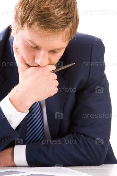 Портрет вдумчивого бизнесмена, который смотрит на документы во время планирования работы