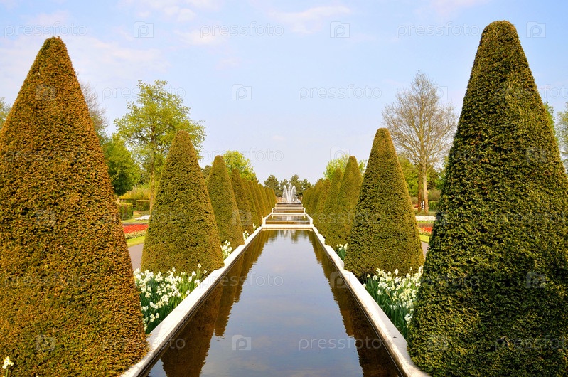 Солнечная аллея с деревьями и водой в парке Кекенхоф в Голландии