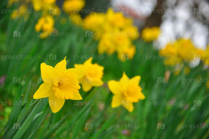 Желтые нарциссы в саду в Германии, Гессен