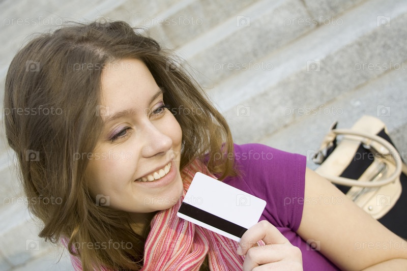 Привлекательная женщина держит в руке пластиковую карточки