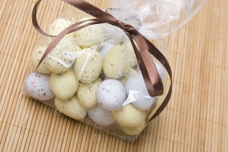 Шоколадные пасхальные яйца в пластиковом пакете с коричневой лентой