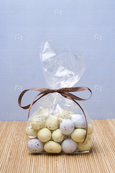 Шоколадные пасхальные яйца в пластиковом пакете с коричневой лентой