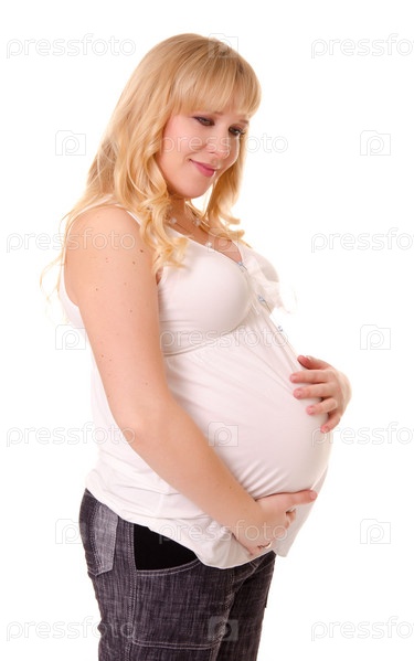 Портрет беременной женщины на белом фоне