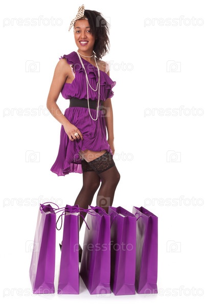 Молодая женщина в фанк стиле с покупками на белом фоне