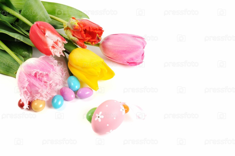 Пасхальные яйца и тюльпаны на белом фоне