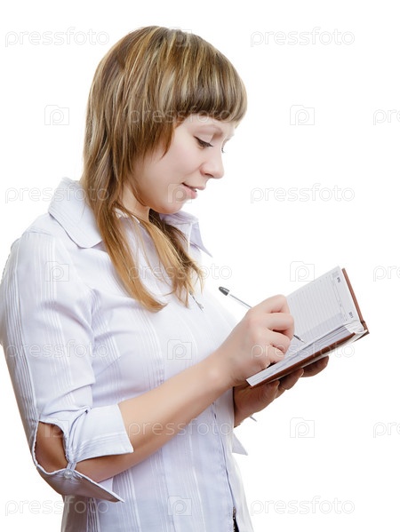 Молодая женщина в белой блузке делает записи в ежедневнике