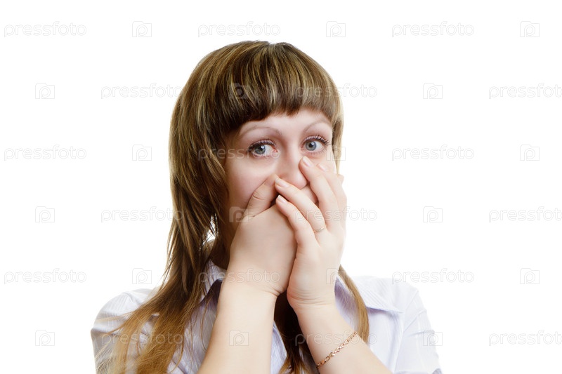Напуганная молодая женщина на белом фоне