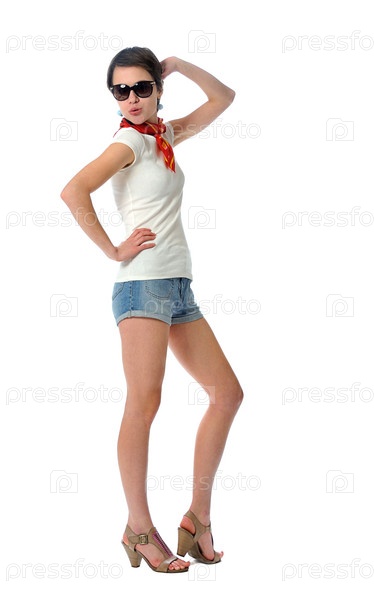 Стройная девушка в джинсовых шортах стоит на белом фоне