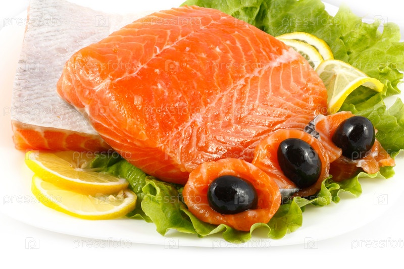 Семга на листьях салата с ломтиками лимона