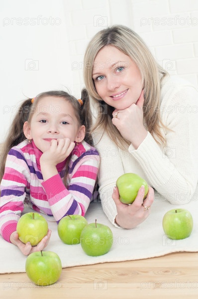 Молодая мама с маленькой дочерью лежат на полу с зелеными яблоками