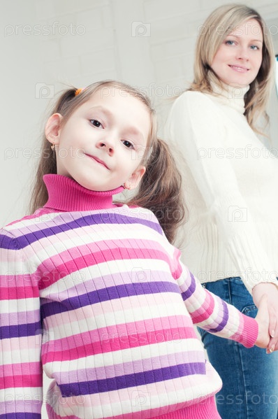 Маленькая девочка держит маму за руку и смотрит в камеру