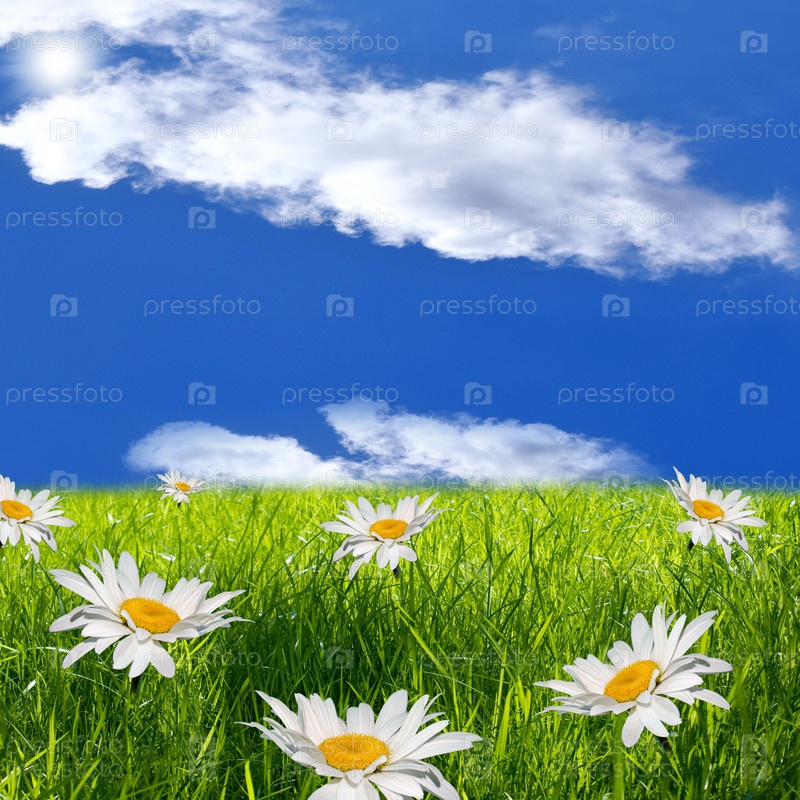Солнечный зеленый луг с ромашками под голубым небом