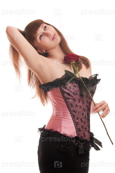 Девушка в корсете с красной розой на белом фоне