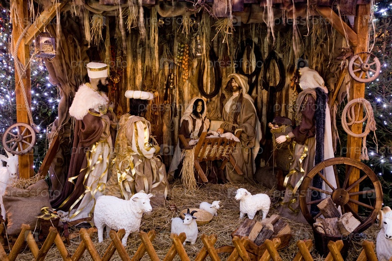 Рождественская сцена с тремя волхвами, преподносящими дары младенцу Иисусу, Марии и Иосифу