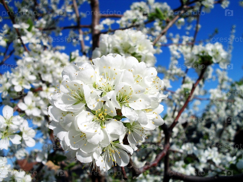 Соцветие цветущей сливы на фоне листьев и синего неба