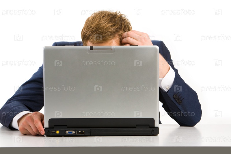 Портрет уставшего бизнесмена, касающегося его головы, сидящего перед ноутбуком