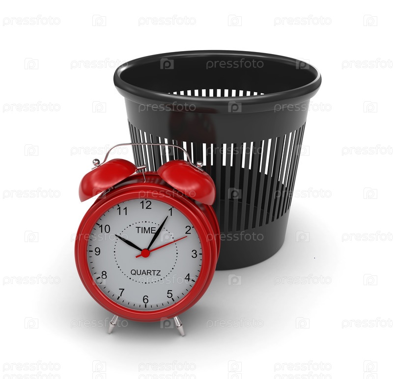 Красный будильник рядом с мусорной корзиной