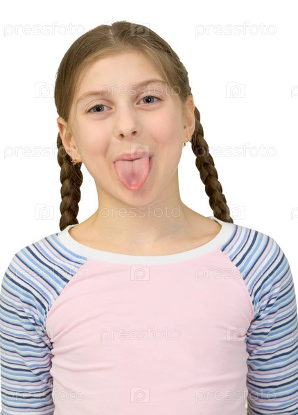 Девочка показывает язык на белом фоне