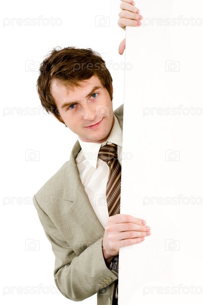 Портрет молодого красивого бизнесмена, заглядывающего из-за борта