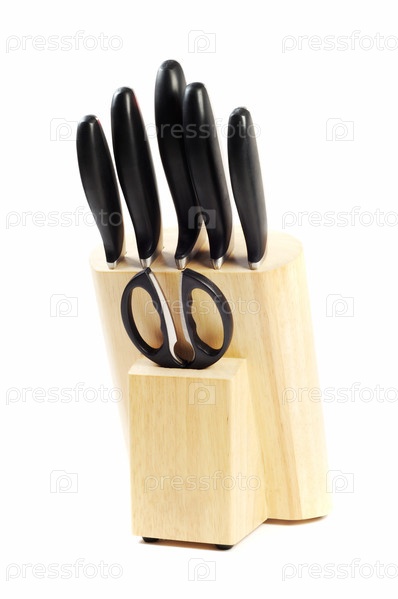 Набор кухонных ножей в деревянной подставке на белом фоне