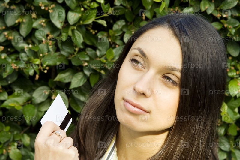 Молодая красивая женщина с пластиковой кредитной картой на улице
